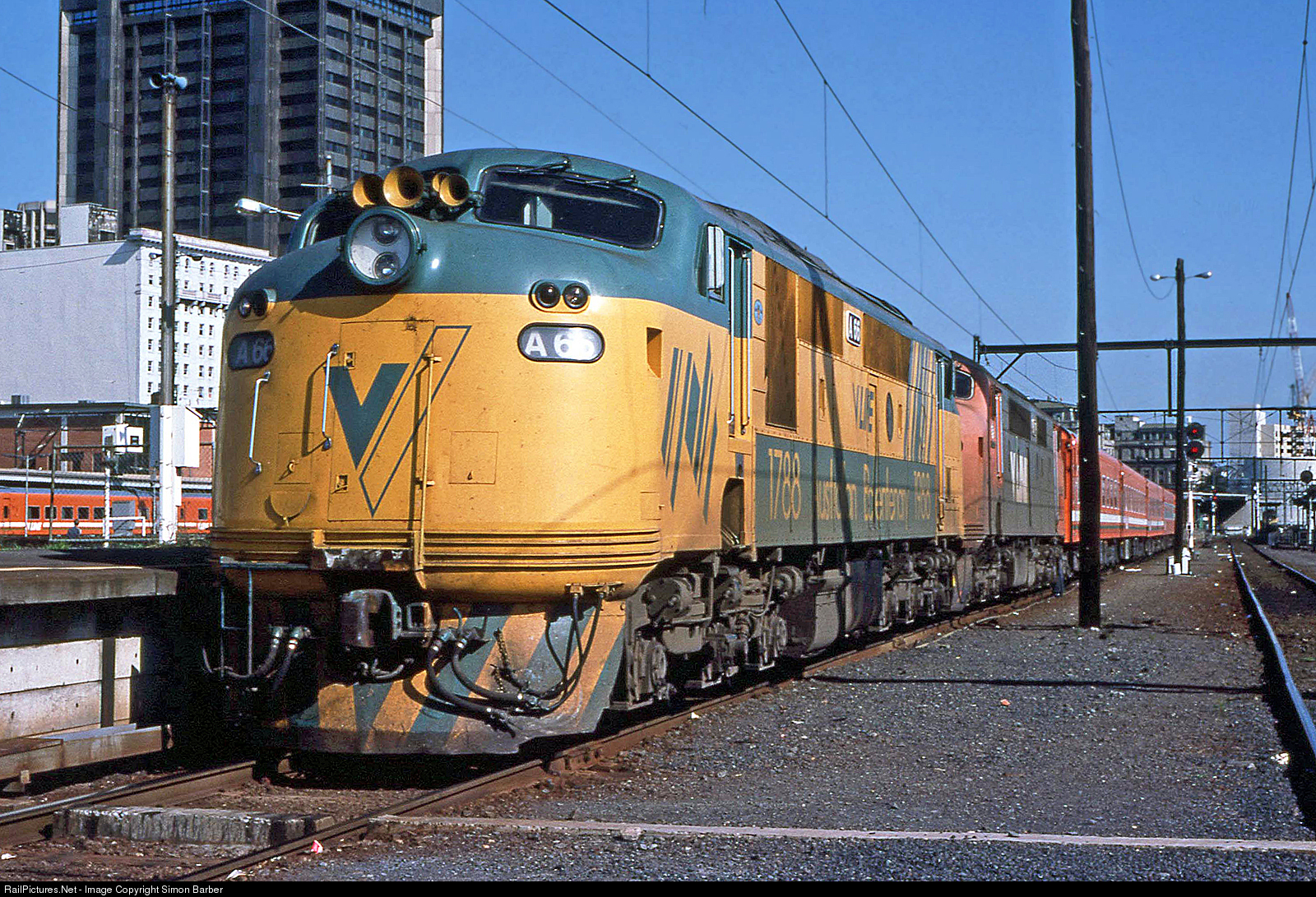 A66 and A71 stand at Spencer Street on a passenger train. A66 was painted in this special livery to commemorate the Bicentenary of Australia.