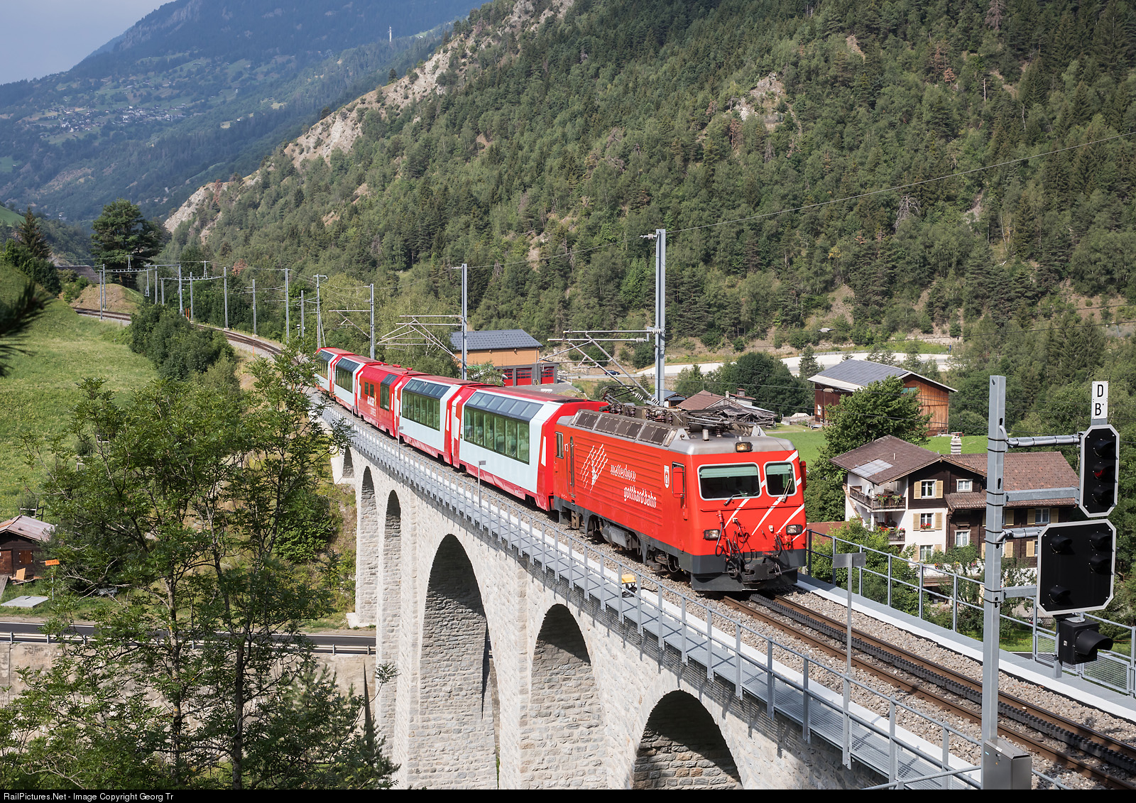Cogwheel locomotive HGe 4/4 II # 103 "Chur", built in 1986 by SLM and BBC for the Furka-Oberalp-Bahn (FO), is pulling the Panorama Express 900 GLACIER EXPRESS from Zermatt to Chur over the Grengiols viaduct.
