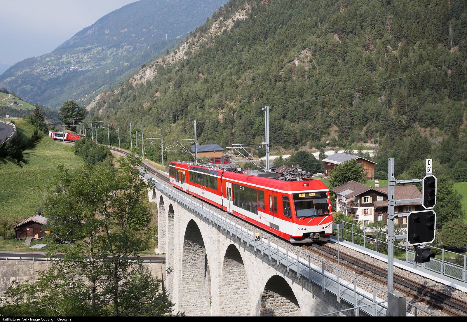 | "Komet" cogwheel train ABDeh 4/8 # 2022 of the Matterhorn-Gotthard-Bahn (MGBahn) is running the regional train 724 from Brig to Fiesch over the viaduct of Grengiols. In teh background in the station of Grengiols is the GLACIER EXPRESS PE 900, which was about 25 minutes delayed this day and which followed the regional train on block distance. |