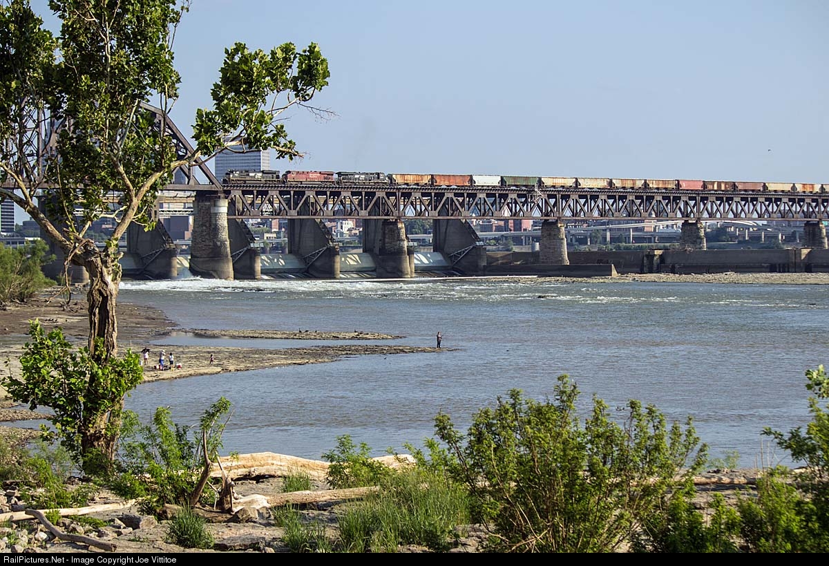 NS and CP power leads a northbound train over the Falls of the Ohio as it enters Indiana from Kentucky.