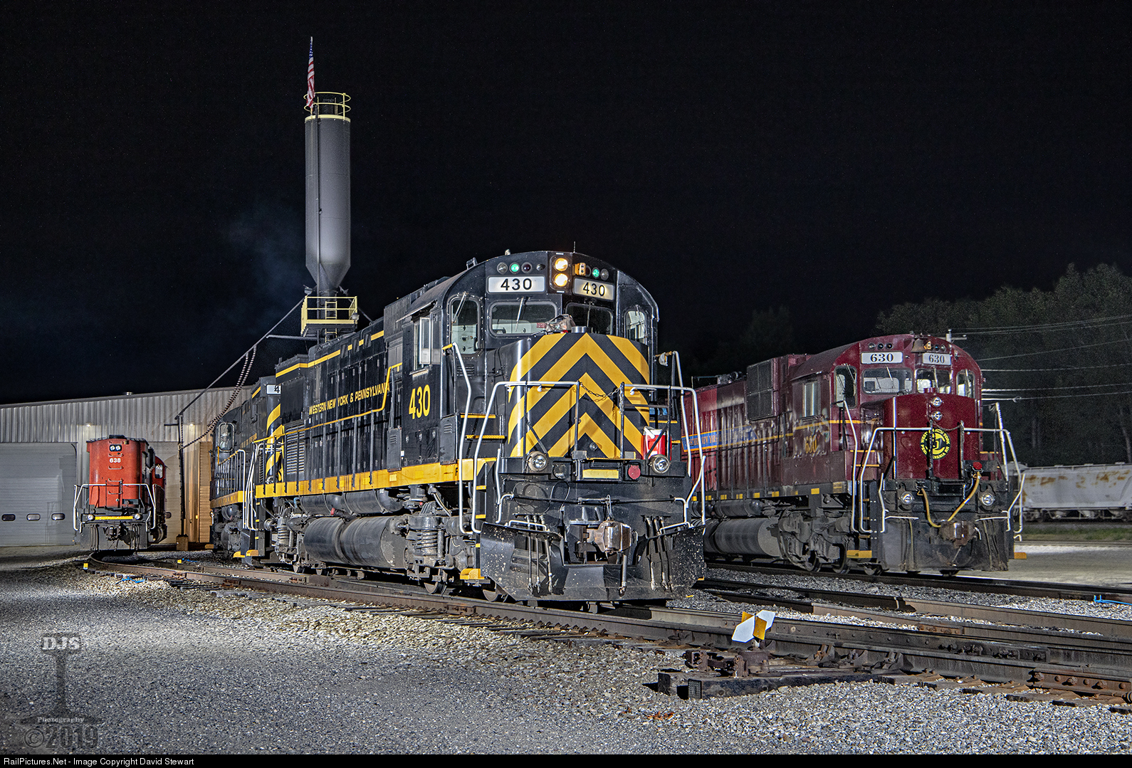 | Almost done for the day is WNYP C430 NÂș430 seen easing into the carrier's service facility at Olean, New York to tie up for the night, the lit markers add a finishing touch to the classic Alco built Century. |