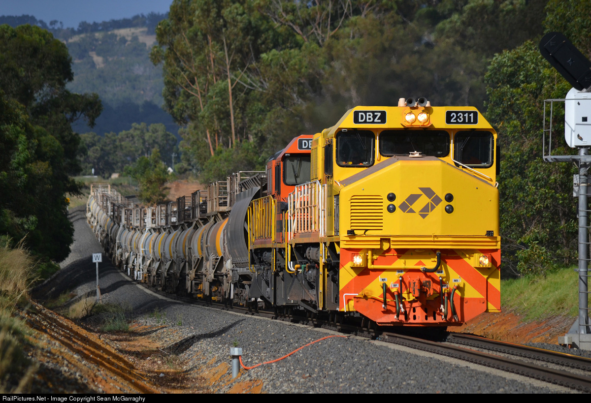 | A rake of empty Worsley Alumina caustic soda tanks from Hamilton race through Burekup powered by the noisy DBZ2311 & DBZ2303 en route to Bunbury Inner Harbour. |