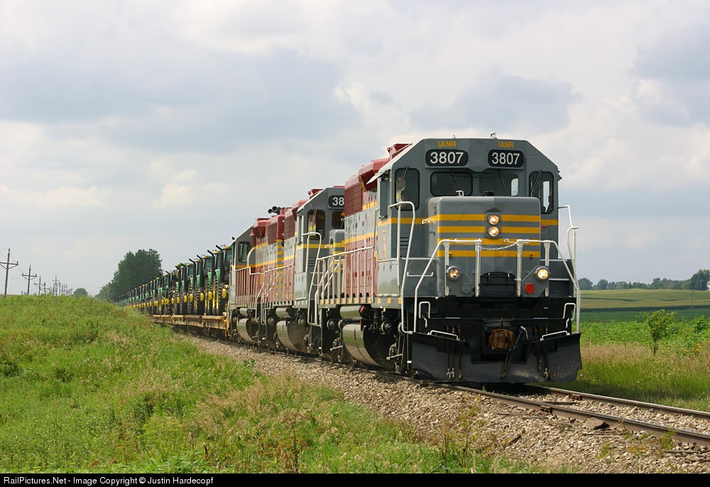 | Less than a month into it's service on the Iowa Northern, IANR 3807 leads a John Deere special southwards towards Cedar Rapids. The train consisted of 81 flats with two tractors on each. Tonight it became UP train SBVGV. (Special: Beverly, IA-Galveston) |