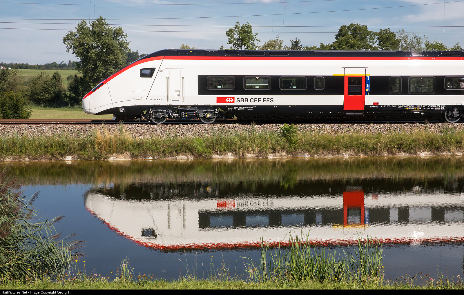 In October 2014, SBB placed an order with StadlerRail for 29 of the new 250 km/h high-speed trains "Giruno" (Stadler designation SMILE), mainly for traffic between Switzerland and Italy, but also for approval in Germany and Austria. Already in September 2016 at the Innotrans exhibition in Berlin a part of the first, not yet finished train was presented. From April 2017, the RABe 501 # 001 was on its first test runs. Initially, 6 pre-series trains were built for test and trial runs and to achieve the approvals. Since the winter of 2019, series production of the other 23 trains in Bussnang has been underway, with assembly and testing taking place at the commissioning centre in Erlen. All trains are to be delivered by the end of 2020. Some of the trains are in the service with passengers between Basel and Zürich already and soon through the Gotthard Base tunnel to Lugano. Train RABe 501 # 011 was seen on this day on test runs on the Thurtal line between Sulgen and Romanshorn. The train is running along the pond at Riedt near Erlen.