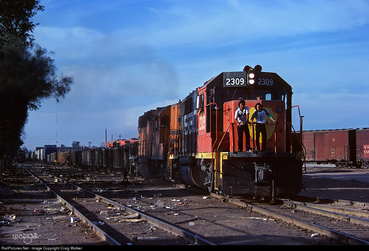 Un par de diésel Ferrocarril Sonora-Baja California cambiaron los vagón en el patio de la SBC en Mexicali, Baja California, el 14 de noviembre de 1981. Un par de SBC GP40-2s, 2309 de dos años y 2108 de nariz alta (construido en 1973), arrastre un corte de vagones de carga en esta ciudad fronteriza. En la frontera con los Estados Unidos (no mucho más lejos que la torre de radio en la distancia), el SBC se intercambia con el Ferrocarril Southern Pacífic. Tenga en cuenta que SBC 2309 usa los colores de Nacionales de México, lo que indica que la era de los ferrocarriles mexicanos independientes pronto se cerraría, cuando el SBD se absorbió en NdeM en 1987. (Otros ferrocarriles independientes en México se fusionaron con el NdeM en la década de 1980 también.)