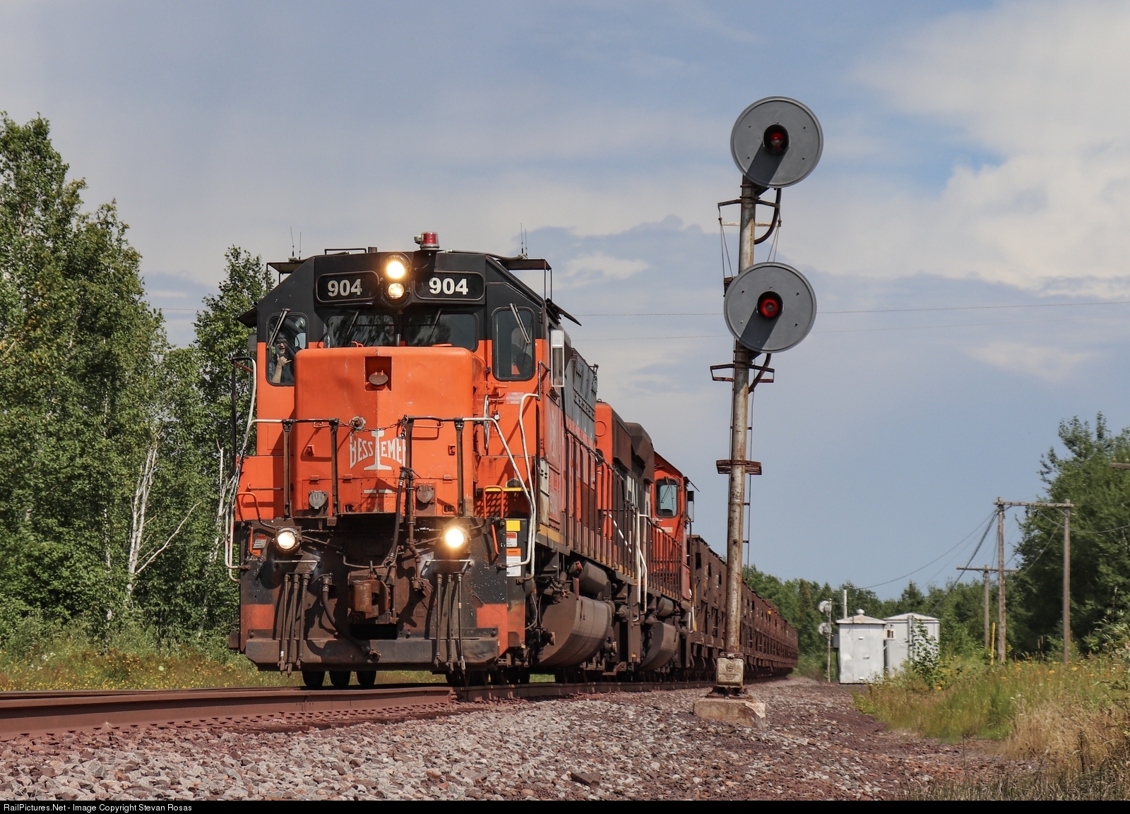 | Bessemer & Lake Erie 904 is out of RC yard duty on an empty ore train bound for MinnTac from Two Harbors. This day was particularly cloudy with scattered thunderstorms in the area but with sheer luck on our side, a perfectly timed break in the clouds appeared just seconds before the train passed our location. |