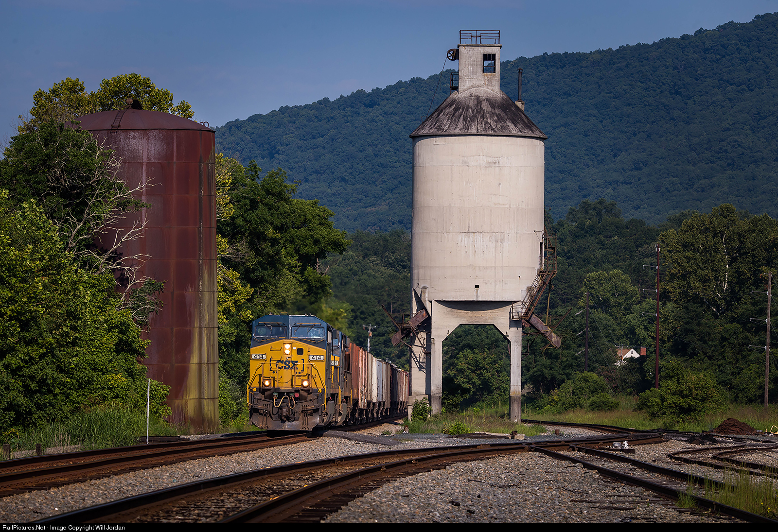 A grain train races through the Shenandoah Valley on the very scenic James River Subdivision, passing the C&O coaling tower at Balcony Falls in lovely morning light.