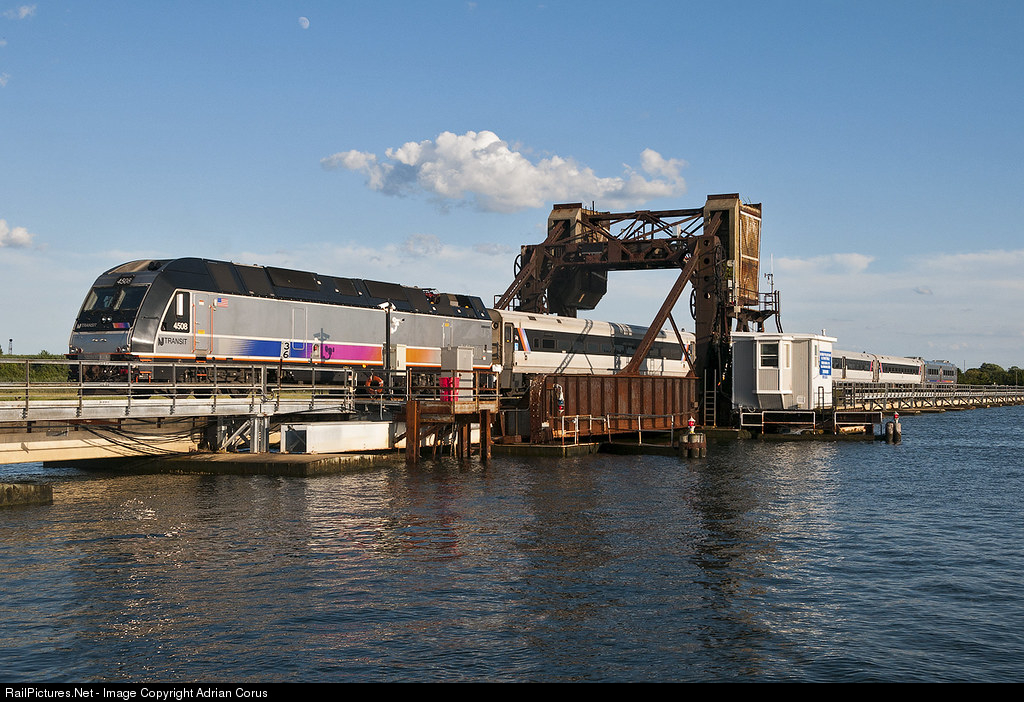 | A westbound shuttle to Bay Head crosses the Brielle Drawbridge on a beautiful Saturday evening. The Brielle Drawbridge spans the Manasquan River between the cities of Brielle and Point Pleasant Beach, NJ. |