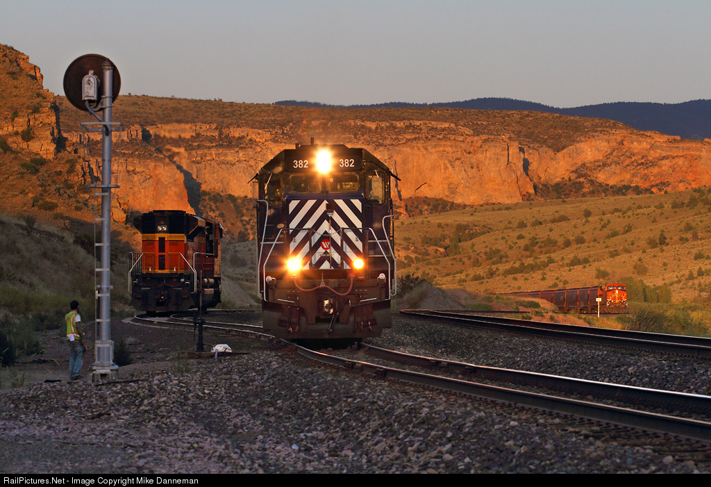 Montana Rail Link’s Helena local is preparing to pick up a BNSF SD70ACe off the house track at Lombard, Montana, in some of the very last sunlight of June 28, 2016. Two days before, BNSF No. 9105 was a rear DPU on an eastbound grain train passing through Lombard Canyon when it developed a traction motor problem and flat-spotted a wheel set. It was set out at Lombard where local mechanical personnel traveled miles on rough, dirt roads to work as best as they could to grind out the flat spots. The locomotive is now being moved by the local to Toston, which has better road access, so more work can be performed. On this day, MRL No. 382 is the last SD45 operating on the railroad, and has only two more trips on the local before possible retirement. In the background, an eastbound grain train’s DPU is about to disappear around a curve on the main line.