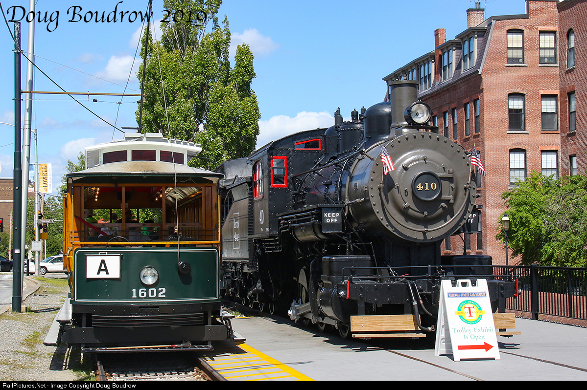 Car 1602, a replica of an early 1900s Brill Breezer Car departs the Lowell Visitor Center platform with a tour group Boston & Maine 410, with is an 0-6-0 switcher built at the Manchester Works of the American Locomotive Company and worked the very tracks that the historic trolleys run on today.