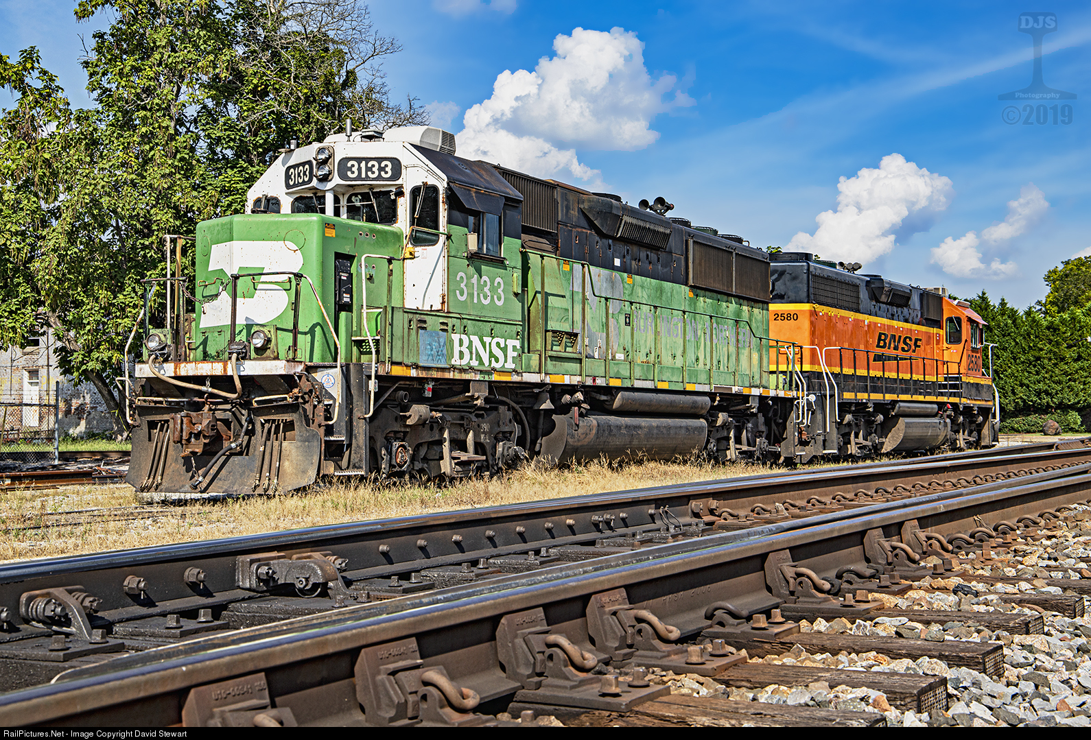 | BNSF GP50 3133 in it's weathered attire is at New Albany, Mississippi along with a GP39-2 for local duties and is seen on August 11, 2019. |