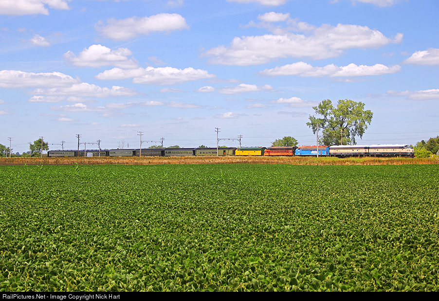 Wagons east! BN 1, BN 2, METX 308, MILW 118C and CNW 411 power the coach train at Seeman Road.