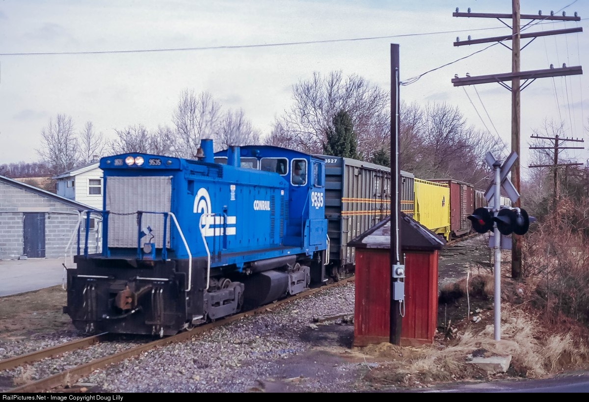 Conrail local WHRE-10, in the charge of a former Penn Central SW1500, passes a phone box on Sinking Spring, Pennsylvania. The local, which served the remnants of the Reading & Columbia Branch, has just left the Lebanon Valley Branch. Today, this line is operated by East Penn Railway.