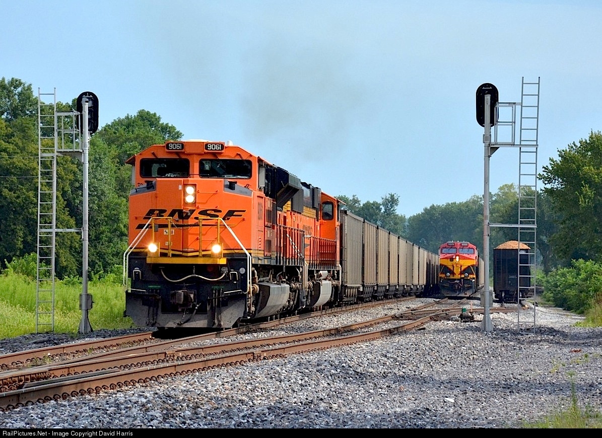 BNSF power heads south on KCS with coal loads, while a train of empties waits in the siding. An SD70ACe (9061, blt August 2012) pairs with ancestor SD70MAC (9750, blt April 1996) on the loads, while months-old KCS ET44AC 5009 brings up the rear as dpu on the empties.