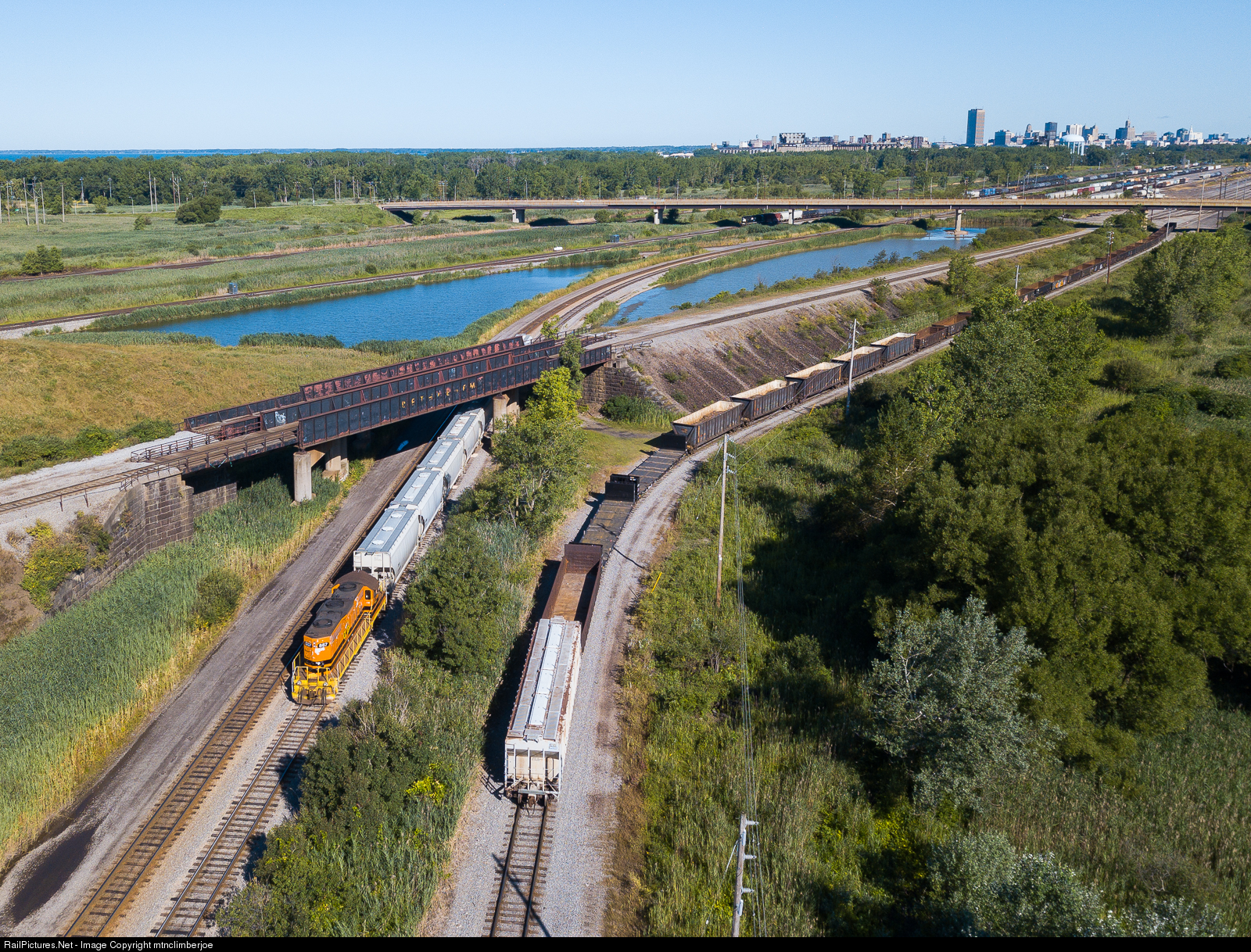 A Buffalo & Pittsburgh GP9 is working the yard at Tifft Street south of Buffalo. The switch job is pulling under the Bethlehem Steel bridge while Lake Erie and the downtown Buffalo skyline can be seen on the horizon.