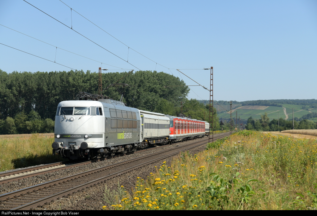 Railadventure 103 222 with an EMU type 420 near Himmelstadt in the Mainvalley. The business of Railadventure is special transporting of multiple units through Europe.