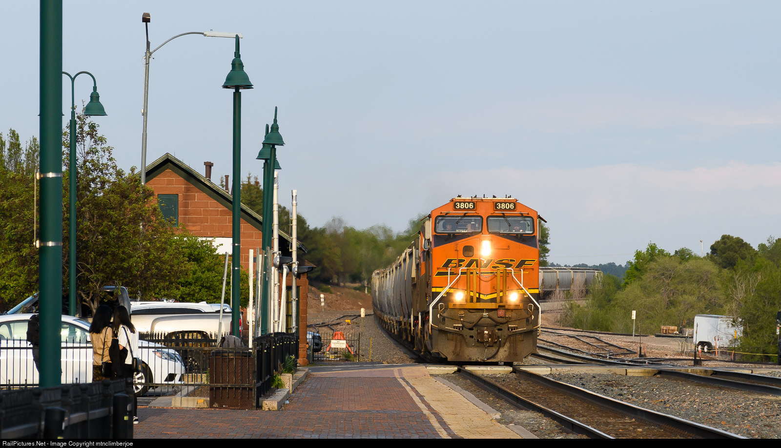 | A BNSF grain train breaks the evening silence in downtown Flagstaff, Arizona as it roars past the old freight house with six locomotives in a 2x2x2 DPU setup. |