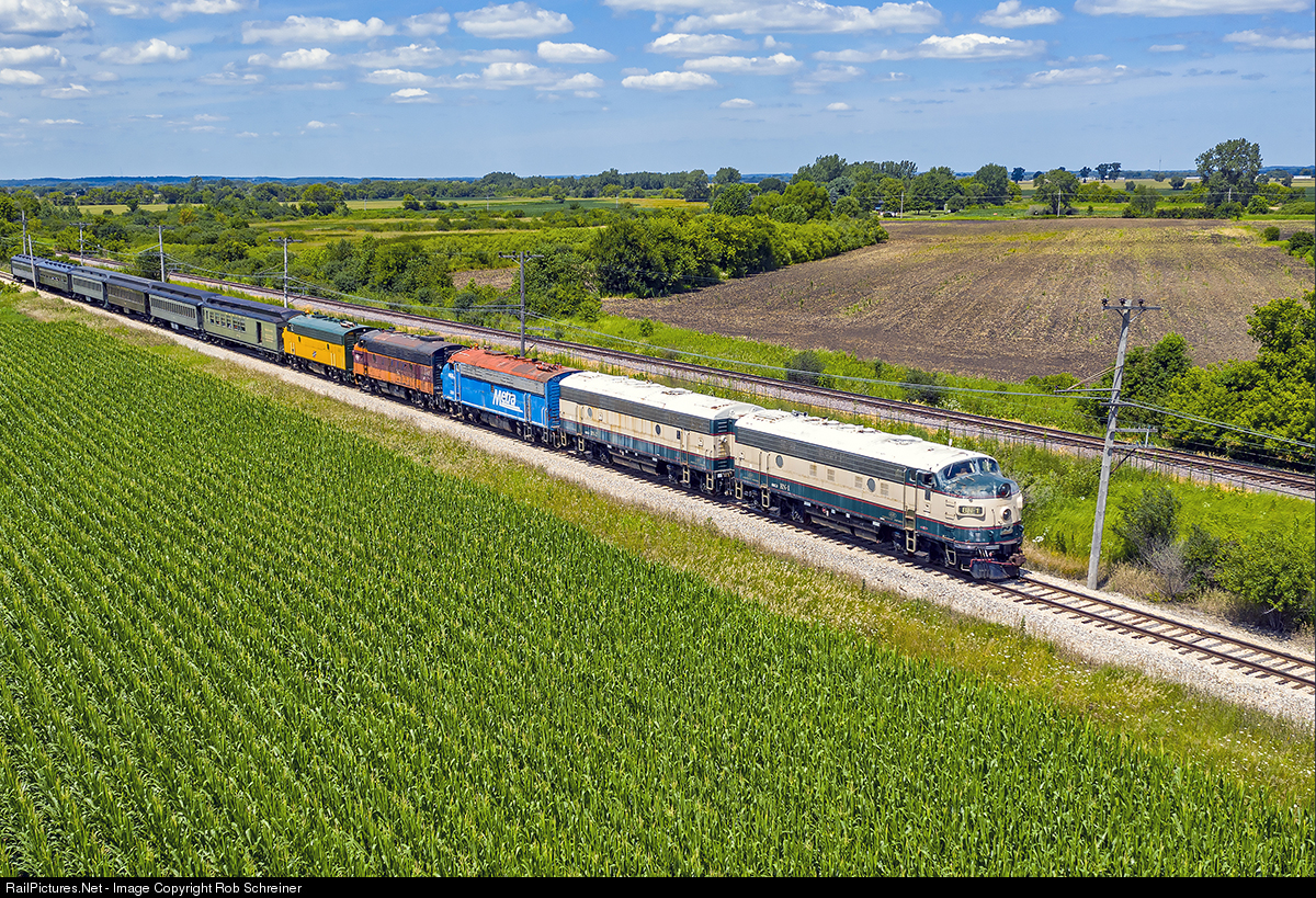 The coach train rolls eastbound through the farm fields in Union, IL. Burlington Northern 1 (EMD F9A) leads five F Unit set, trailing are the Burlington Northern 2 (EMD F9B), Metra 308 (EMD F7A), Milwaukee Road 118-C (EMD F7A) and Chicago And Northwestern 411 (EMD F7A).
