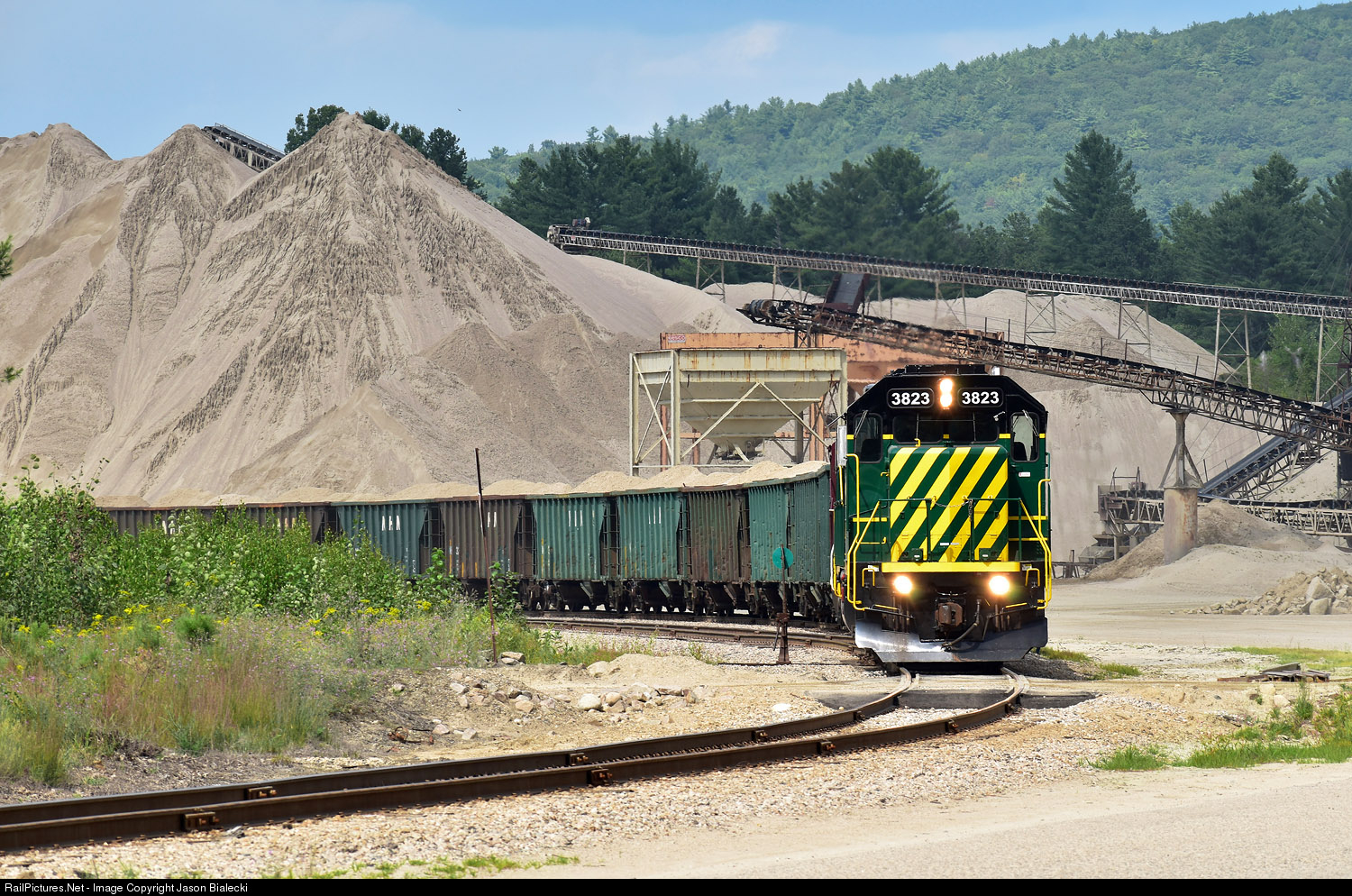 A loaded New Hampshire Northcoast sand train at the Ossipee Aggregates quarry, sand and gravel pits.
