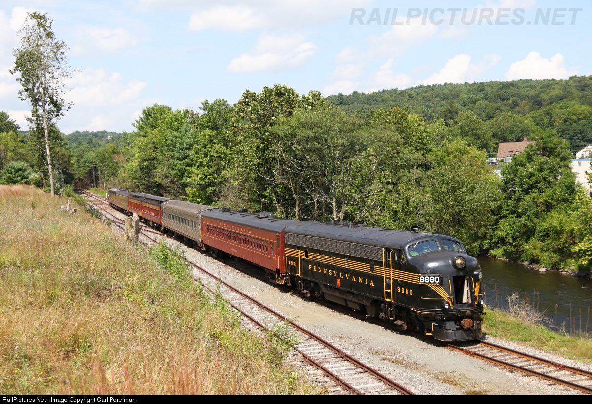 The Stourbridge Line excursion train is returning from Glen Eyre. The FP7 is pushing the consist, as the train departs Hawley bound for Honesdale. Due to the hot weather, the engine crew has left the nose door open, to allow for a breeze.
