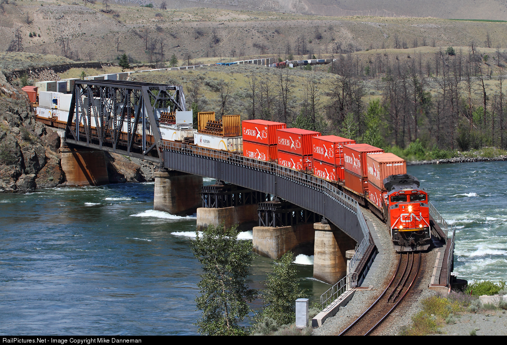 Led by EMD SD70M-2 No. 8852, Canadian National intermodal train No. 112 crosses the Thompson River west of Savona, (east of Walhachin), British Columbia, on July 22, 2011.