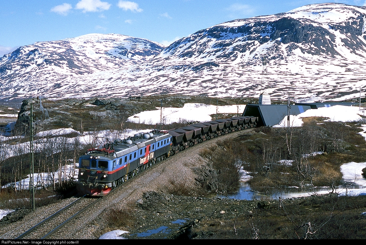 DM3 1223,1241 and 1224 with an iron ore train for Narvik, approach Vassijaure which is around 200 miles north of the Arctic Circle. These powerful locos have steam loco style rods connecting their driving wheels and look amazing when travelling at speed! Seen in 1999.