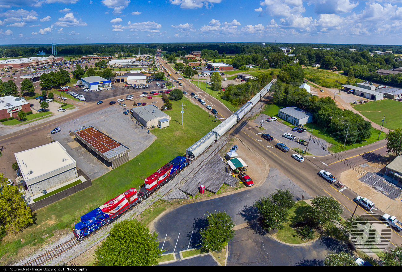 Stars and Stripes down Main Street. After nearly two months since the debut, I finally managed to catch a freight with Grenada Rail’s new paint scheme. It looks great. Here 8332 leads a northbound freight over Commerce Street after picking up cars in Hernando.