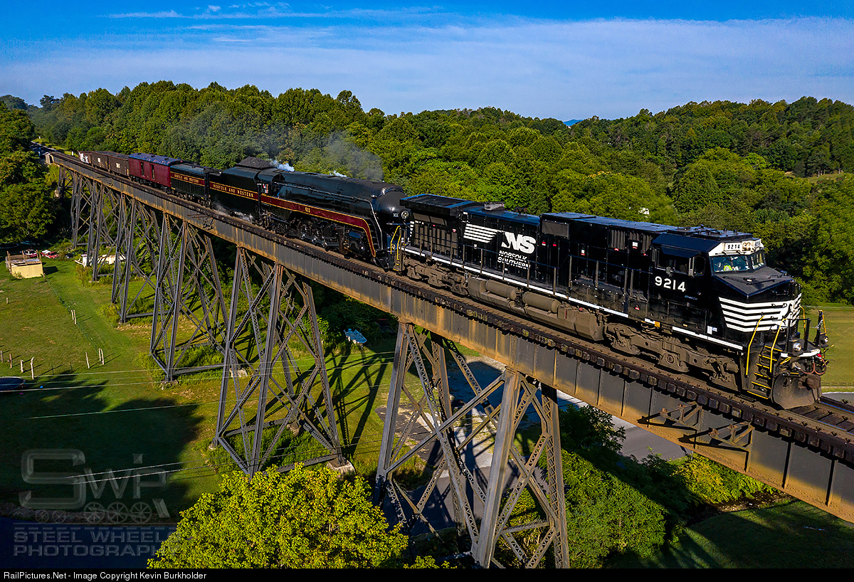 On August 19, the Virginia Museum of Transportation’s 4-8-4 steam locomotive, N&W 611, began its trek to Strasburg, PA, behind NS C40-9W 9214. The 611 and support equipment were supposed to be in Enola, PA late this evening, however it appears that it will be an early am arrival. Train is seen crossing the trestle just north of the town of Troutville, VA.