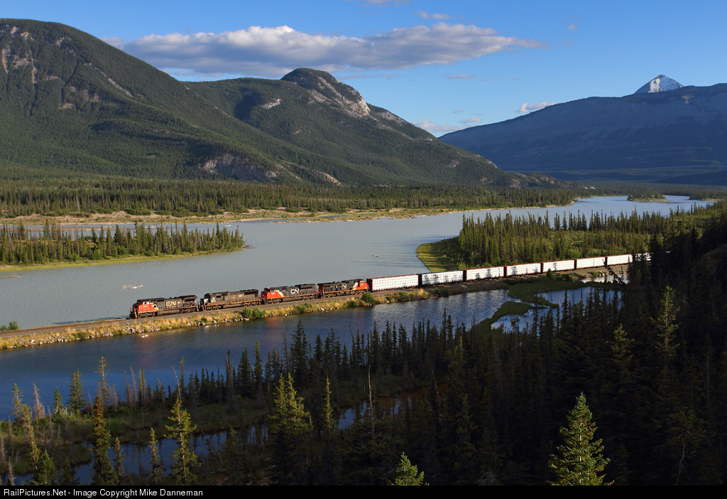 On a beautiful July 10, 2014, Canadian National train No. 304 approaches Windy Point west of Devona, Alberta, in scenic Jasper National Park.