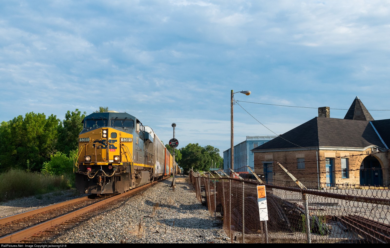 In the golden hours of August 17th, CSX unit autorack train Q230 makes an appearance in Troy, Ohio. The train is shown here passing a still active B&O Color Position Light signal, and the old Cincinnati, Hamilton, and Dayton railroad station that is now being used by CSX as a MoW depot.