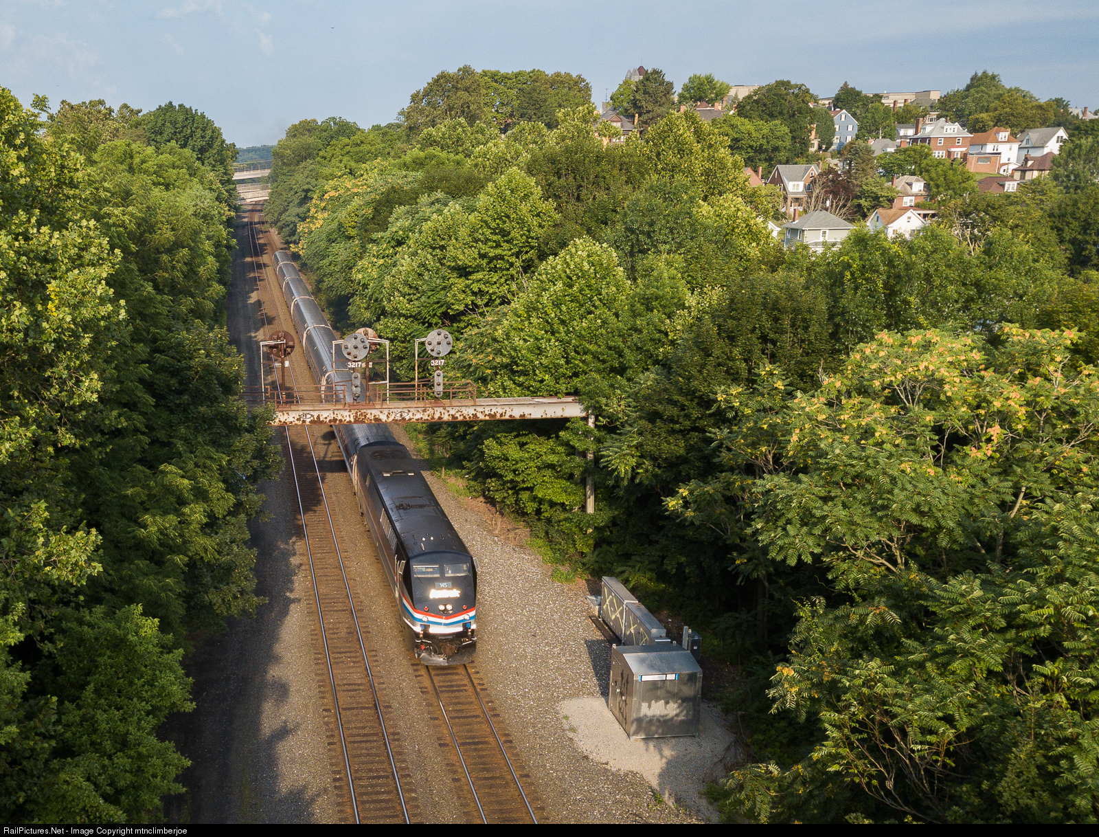 | Amtrak's Phase III heritage unit is on the point of the eastbound Pennsylvanian as it throttles back up to track speed after making an on time station stop in Greensburg. The train is passing under the PRR position light signals at 321 that would be removed from service a week later. |