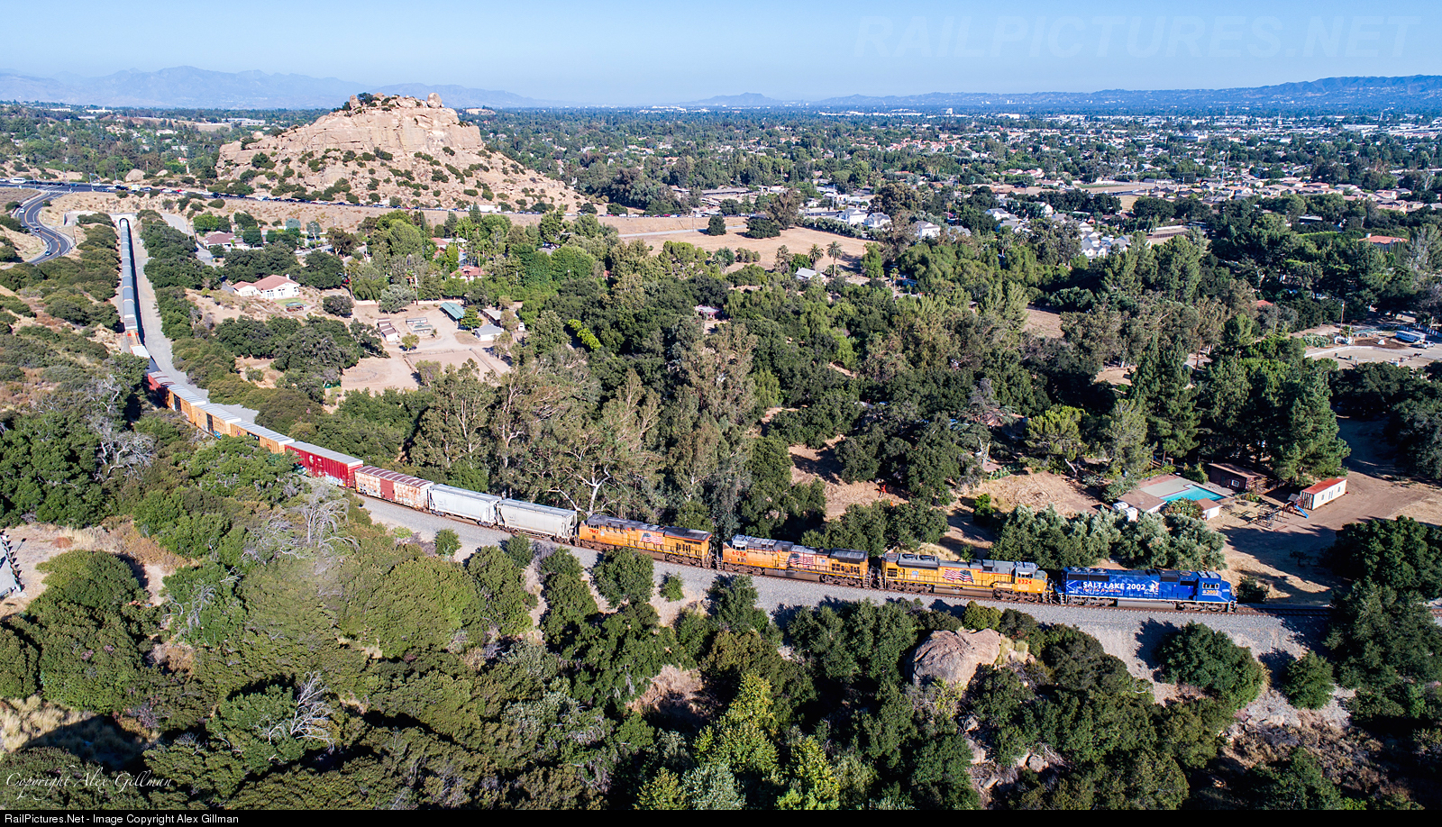 | Beginning its assault on Santa Susana Pass, UP 2002 and three other units notch up as they lug the LOF67 off the San Fernando Valley floor and through Tunnel 28 (off in the distance to the left). Shortly the train will enter Tunnel 27 followed by the longest of the three, Tunnel 26, before being deposited in Simi Valley. |