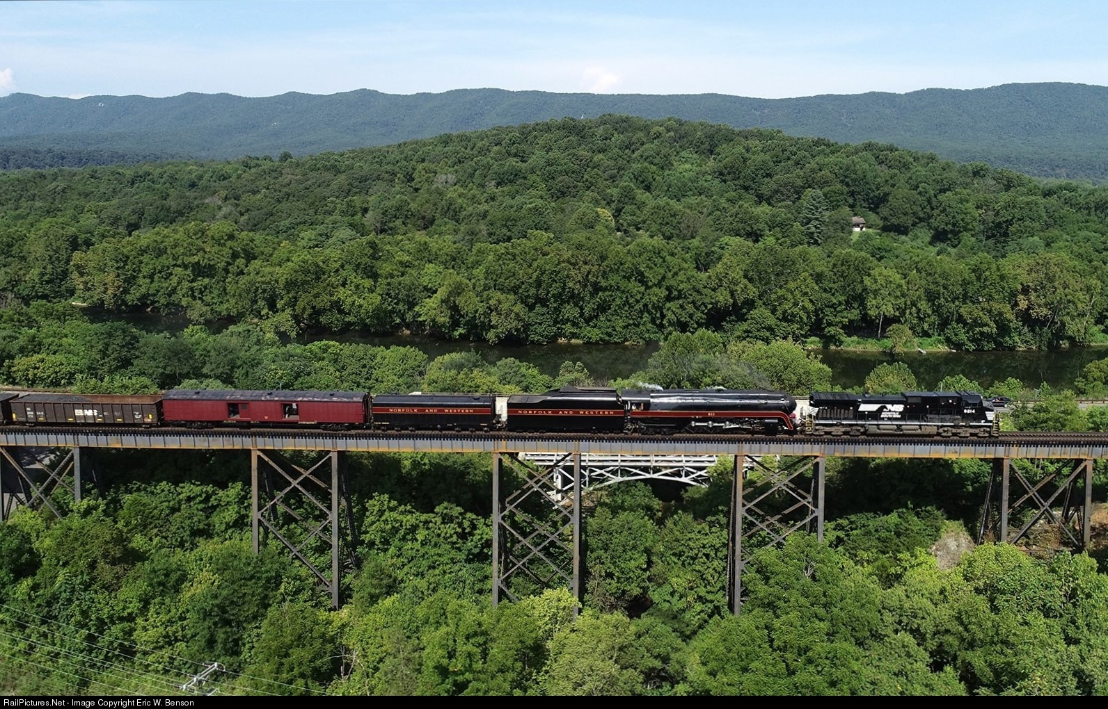 NS 955 with the N&W 611 J rolls over the high trestle at Overall on a beautiful morning in the Shenandoah Valley.