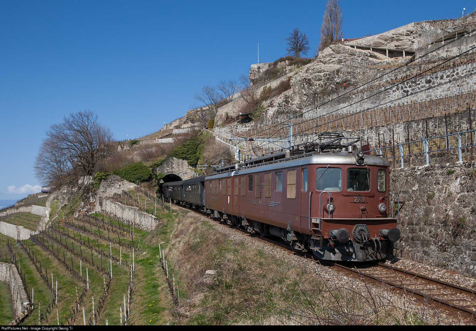 Ae 8/8 273 of the BLS, which wasn't in regular service any more, pulled a charter train of Eurovapor from Lyss to Domodossola through the vineyards above Lake Geneva, down the 3.8 % grade track of the former independent "Vevey-Chexbres". The train is just rolling through the only 20 meter long Salanfe tunnel. Nowadays, the Ae 8/8 273 is not operational historic locomotive of the BLS Stiftung in the depot of Burgdorf.