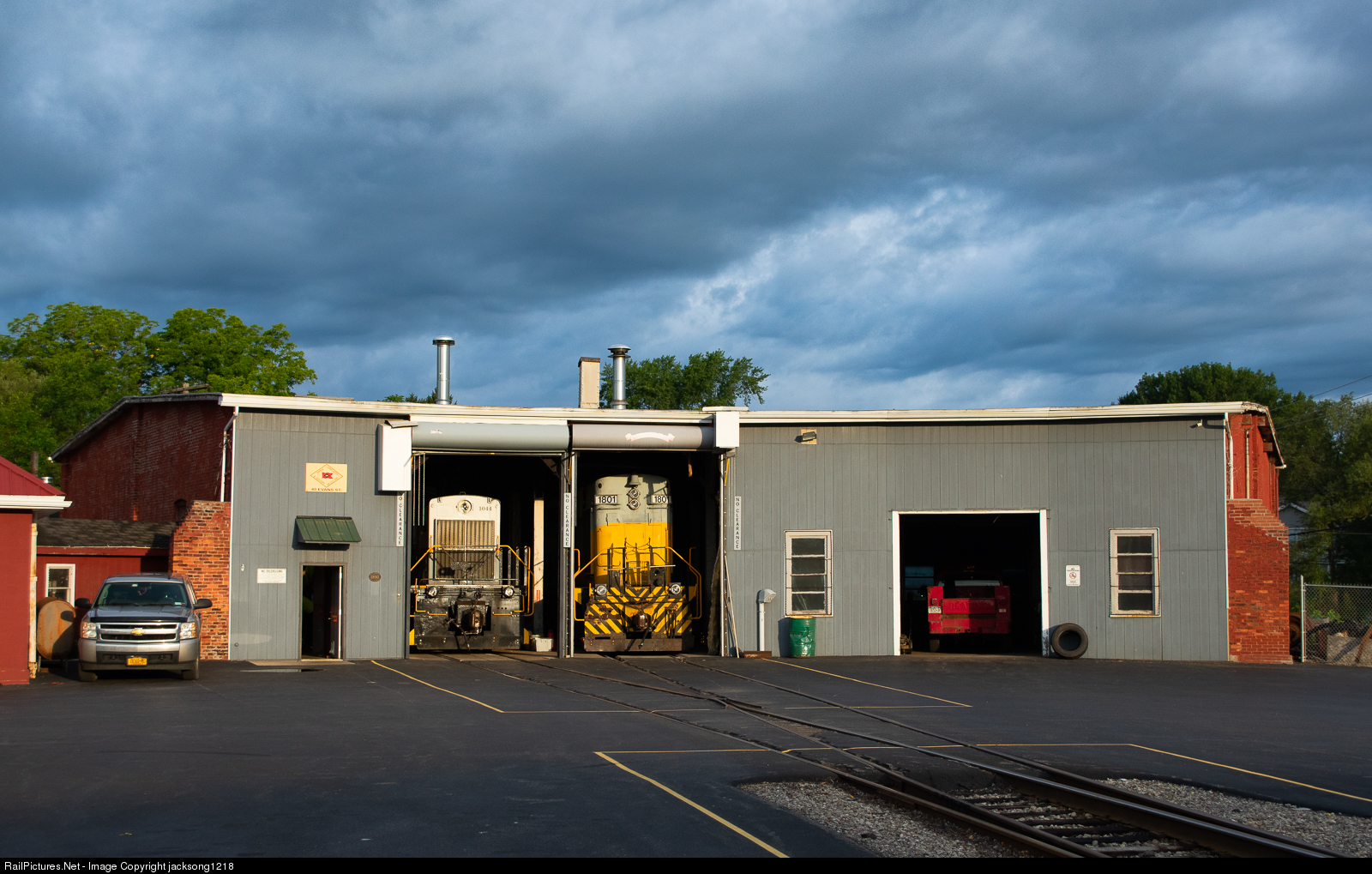| As the morning clouds break and sunlight starts to appear, GVT Alcos numbered 1044 (Alco S6) and 1801 (MLW RS18) wait to be started and pulled out of their bays for the days switching. |