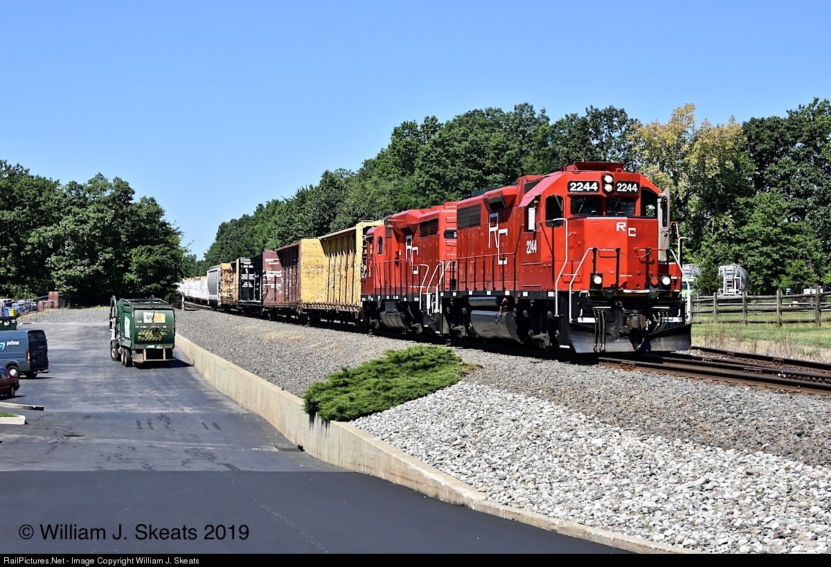 | RC-2 leaving the railway’s Upper Yard. The crew pulled a hopper from storage at the Upper Yard. The train also includes empties pulled from Certainteed located on the Northfield Industrial Track. Viewed from Fieldcrest Avenue RR Crossing. Heading for the Lower Yard. |