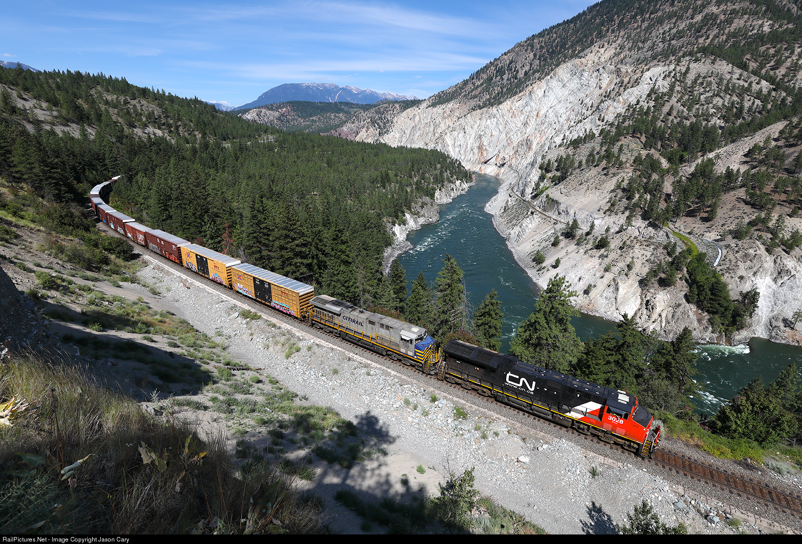 A fairly new Tier IV GE climbs one of the many summits along Canadian Pacific's ROW along the Fraser and Thompson River Canyons. The eastbound train is passing by the famous White Canyon on its scenic trip to Kamloops. The scenery and near constant rail action makes this one of the most spectacular railfan locations in North America.