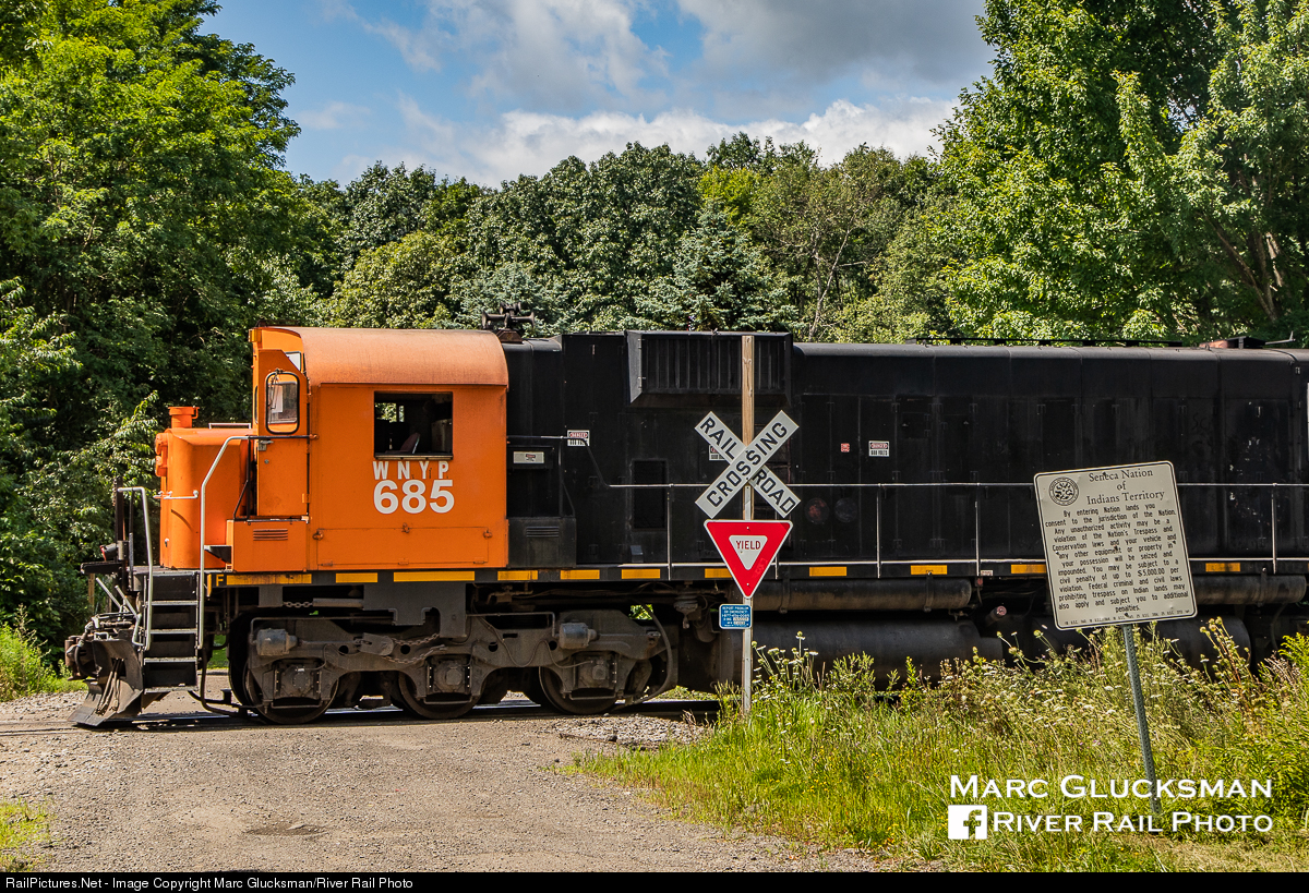 Respecting the Nation’s laws. As the Western New York & Pennsylvania Railroad’s six-axle ALCO/MLW era draws to a close, OL-2 is returning from East Salamanca, NY on Monday, August 19, 2019. WNYP 685 (M636, ex-Quebec Cartier Mining 85) passes of Cemetery Road bear Kill Buck, NY, passing a sign that reminds motorists to respect the laws of the Seneca Nation of Indians Territory while traveling through the area.