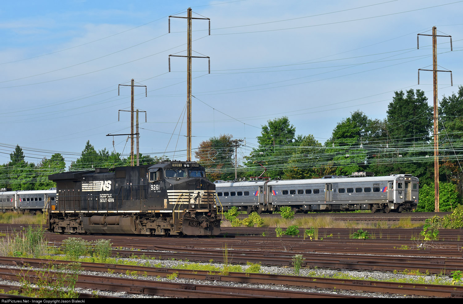 | This lone NS locomotive has been resting here in the Stiles Street Yard for a number of days. This sizable rail yard, which is normally vacant, parallels the very busy Northeast Corridor (NEC). A late 1970s built multiple unit (MU) train – fitted with single-arm pantographs in 2013 - speeds past 9261. |