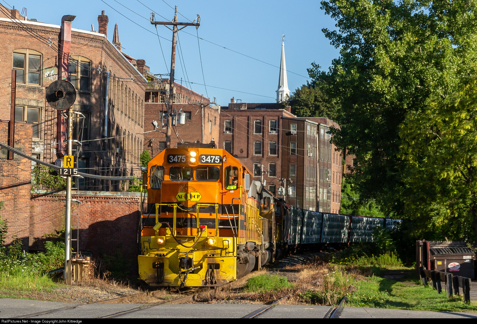 NECR SD40-2 3475 (originally built as an SD45) leads two of its comrades and 56 cars of miscellaneous freight through the shadows of downtown Brattleboro, VT. After a crew and symbol change, and some switching, the train will depart southbound for Palmer, MA.