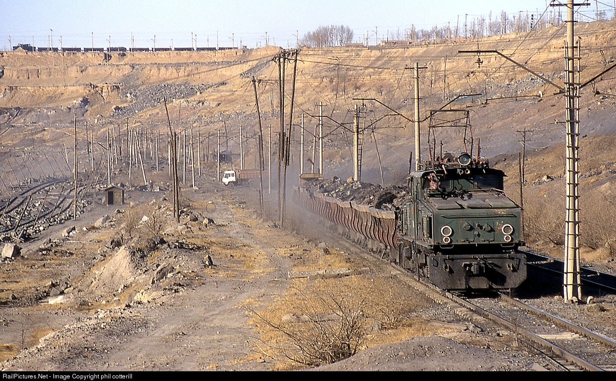 East German built, BoBo electric loco, No 7342 stirs the dust as it climbs out of the massive open-cast pit at Pingzhang in 2002. Note another similar train, top left of photo.