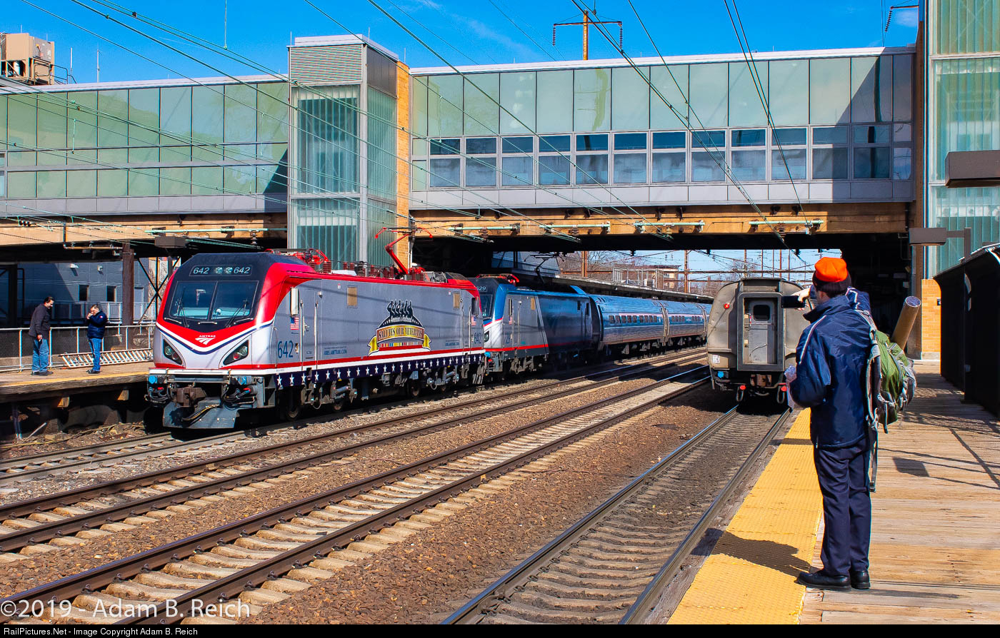 He's Not Throwing Away His Shot: A railfan grabs a shot of the New Jersey Chamber of Commerce Special at the Trenton Transit Center on February 28, 2019, while crew members from the train grab some air on the opposite platform. Note the distinctive ACS-64 #642 appearing as part of the doubleheader powering this train.