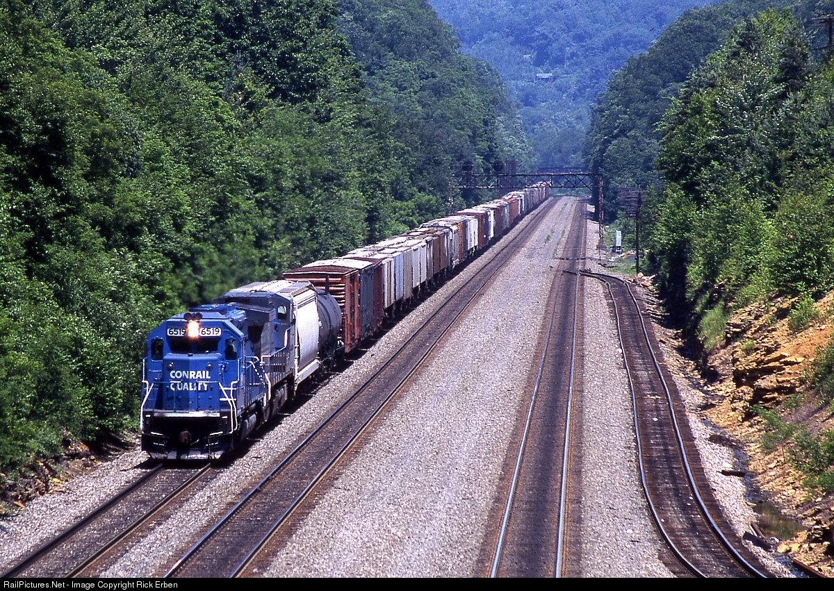 It's a splendid summer afternoon as a westbound manifest comes rolling down the straightaway between Cassandra and Portage. At one time there was an interlocking here, where the O Secondary track from Portage (on the right) joins the main; now it is just a hand-operated turnout. There was once a Ben's Creek branch that also diverged here. Eastward signals were mounted on a highway overpass that is our vantage point. The Cassandra overpass can be seen in the distance beyond the westbound signal bridge. Fuji Sensia.