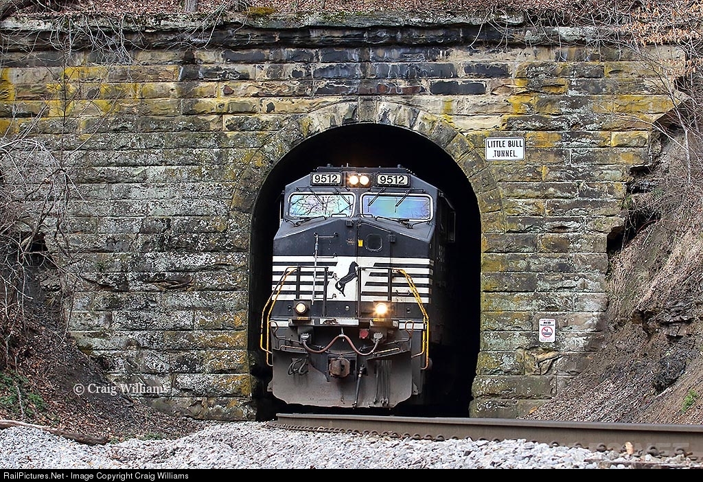 Here we have a loaded coal train out of Andover creeping slowly thru the Little Bull Tunnel. The train is fighting hard to hold back the train on the steep 1.7% grade. Right behind me is the Big Bull Tunnel. Little Bull Tunnel is on a 10 degree curve and 327 feet long. A 3 unit manned helper set will tag along all the way to Bluefield. This train is bound for Clover, VA.