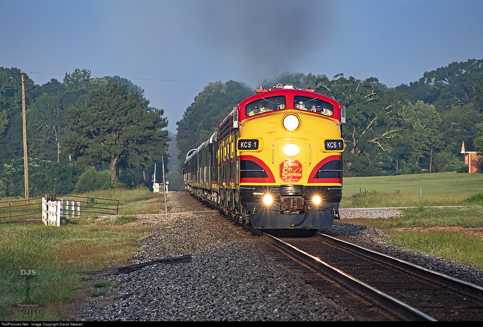 | This is about as nostalgic as it can get east of the Mississippi River on a class one carrier. On August 21st and 22nd, dignitaries from KCS and NS inspect the route over a two day period from Shreveport to Atlanta, photographers inspected the OCS and locations it passed through as in the case with this early morning scene not long after sunrise at Russell, Mississippi on NS's AGS South District of the Alabama Division. |
