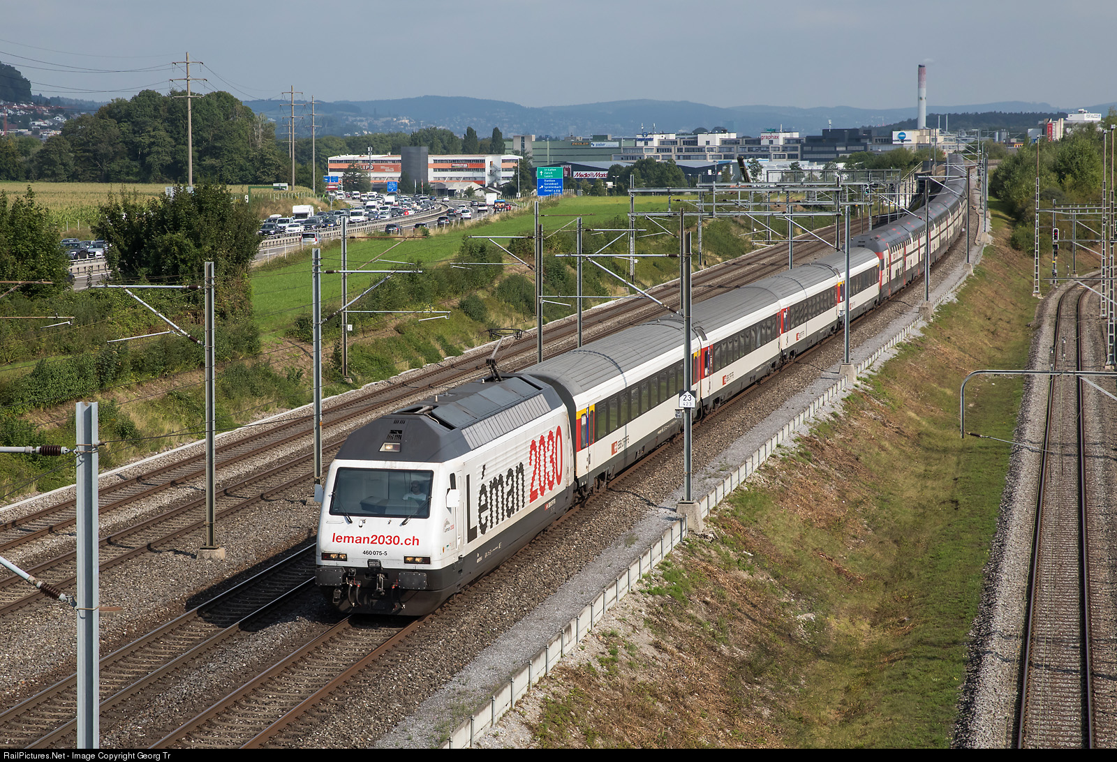 Third train of the bundle was this day the IC of the line IC1 from St.Gallen to Geneva Airport, nonstop from Zürich HB to Berne, train IC 726 with leading Re 460 # 075 in the "Léman 2030" paint scheme, followed by 4 standard cars type IV, then the IC 2000 doubledeck push-pull train with Re 460 # 092 pushing far in the rear.
