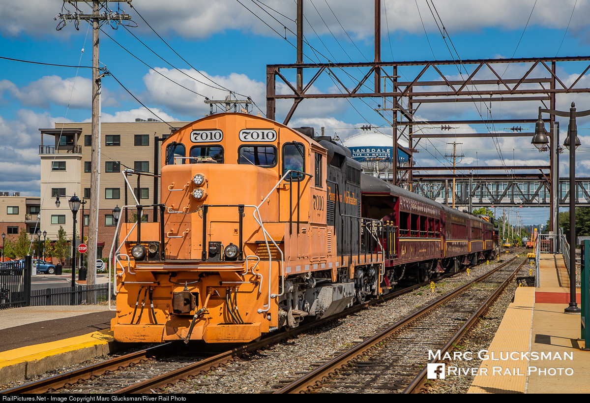 Pennsylvania Northreastern/New Hope & Ivyland GMD GP9RM 7010 (ex-Canandian National GP9 4327) sits in the Lansdale, PA station on Sunday, August 25, 2019. On the occasion of Founders Day, passenger specials were operated over the normally freight only former Reading Railroad Bethlehem Branch. Note the "Lansdale: Life In Motion" banner on the water tower.