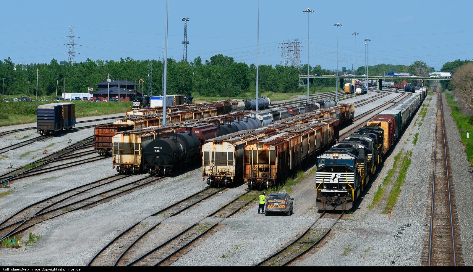 Norfolk Southern manifest freight 309 gets a recrew in Buffalo. Leading this days train is an SD70M with a Phase II cab. The new crew will work Bison yard before continuing west.
