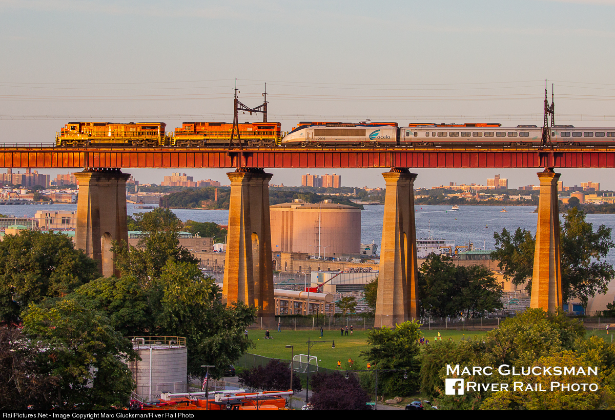 Sorry, just friends. Although at first glance Amtrak Acela 2172 (2005 leading) looks like it it’s being towed, it is only speeding by G&W Providence & Worcester RR’s FPCH (4050, C40-8) on the Hell Gate Bridge. While Acela runs almost hourly during the day, the FPCH is three round trips a week, so it was lucky to catch a meet on the evening of Monday, August 26, 2019.