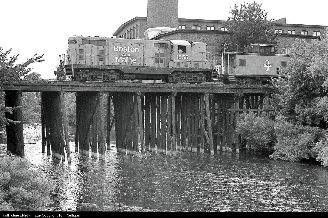 | After GP7 1555 has run around its train on the mainline, Boston & Maine local freight BO-1 out of Cambridge ventures down the Bemis Branch at Waltham, MA, crossing the Charles River past a 19th century factory. This trackage was abandoned in 1991 and the wood pile trestle was removed to ease the passage of canoes and kayaks. |